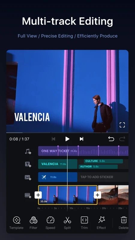O aplicativo oferece sincronização inovadora de ritmo e imagens, e permite ajustar o áudio com suporte para múltiplas trilhas sonoras. A adição de diferentes estilos musicais ajuda os criadores de vídeo a criar e editar conteúdo incrível. Você pode gerenciar a edição de transições selecionando-as da biblioteca de recursos ou criar seu próprio gravador integrado.